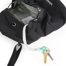 -Main compartment with quick access drawstring closure with key clip.