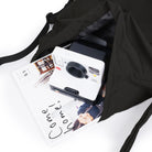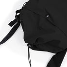 -Wide opening main compartment with snap button and drawstring closure.