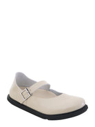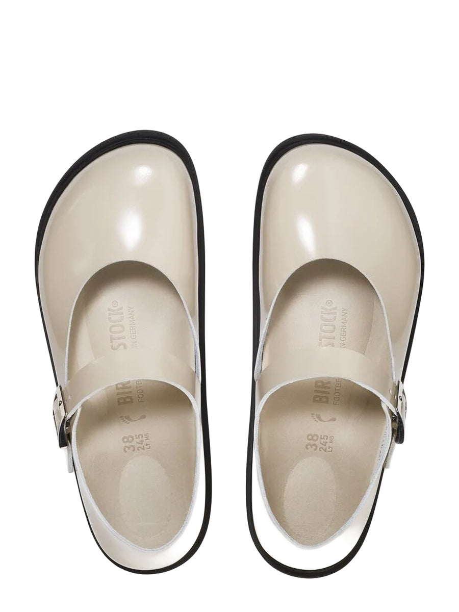 The BIRKENSTOCK Mantova is an interpretation of the classic Mary Jane in a rustic and especially comfy version. The model has an open-selvage, unlined finish which emphasizes its natural look. This version features the Droplet Buckle, which is made entirely of high-quality Zamak in a square shape. Its design combines premium quality with a modern, timeless look. The upper is made of high-quality natural leather with a shiny patent coating.