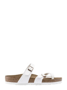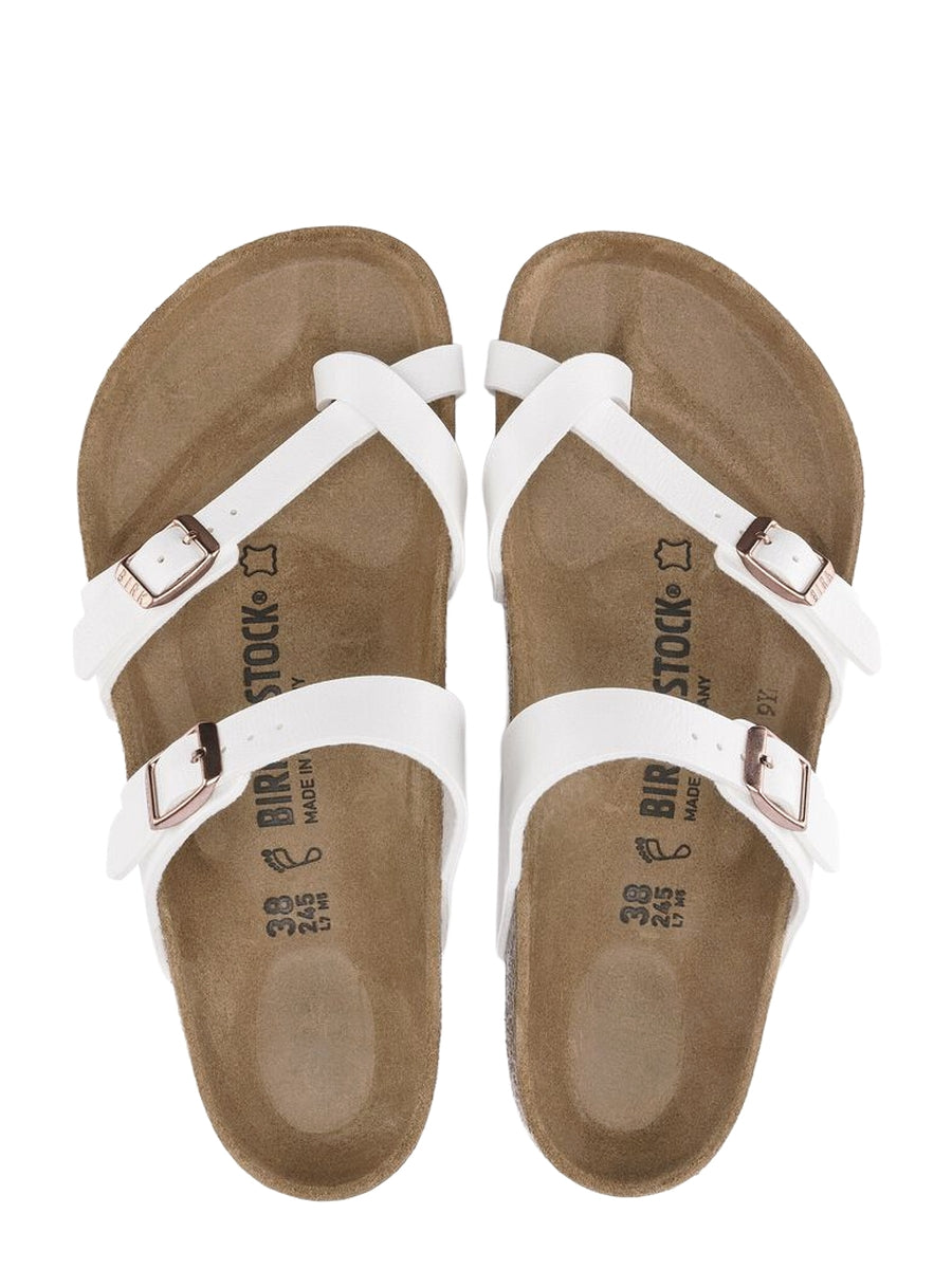 - an elegantly comfortable sandal with adjustable, crisscrossing straps that form a single loop around the toe. Classic support and adjustability, designed beautifully. Shown in white Birko-Flor® with tone on tone outsole and copper tone buckles.
