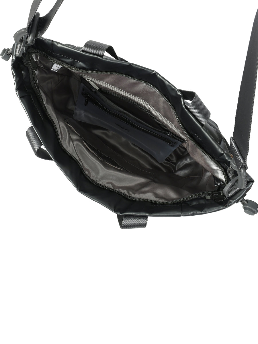 INTERIOR FEATURES 1 key hook 1 interior zip pocket 1 removable water-proof pouch 2 open pockets 1 phone pocket EXTERIOR FEATURES 1 zip pocket 2 hidden zip pockets 2 open side pockets Adjustable and removable shoulder straps Water repellent coating L 33 x W 14 x H 34 cm