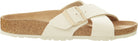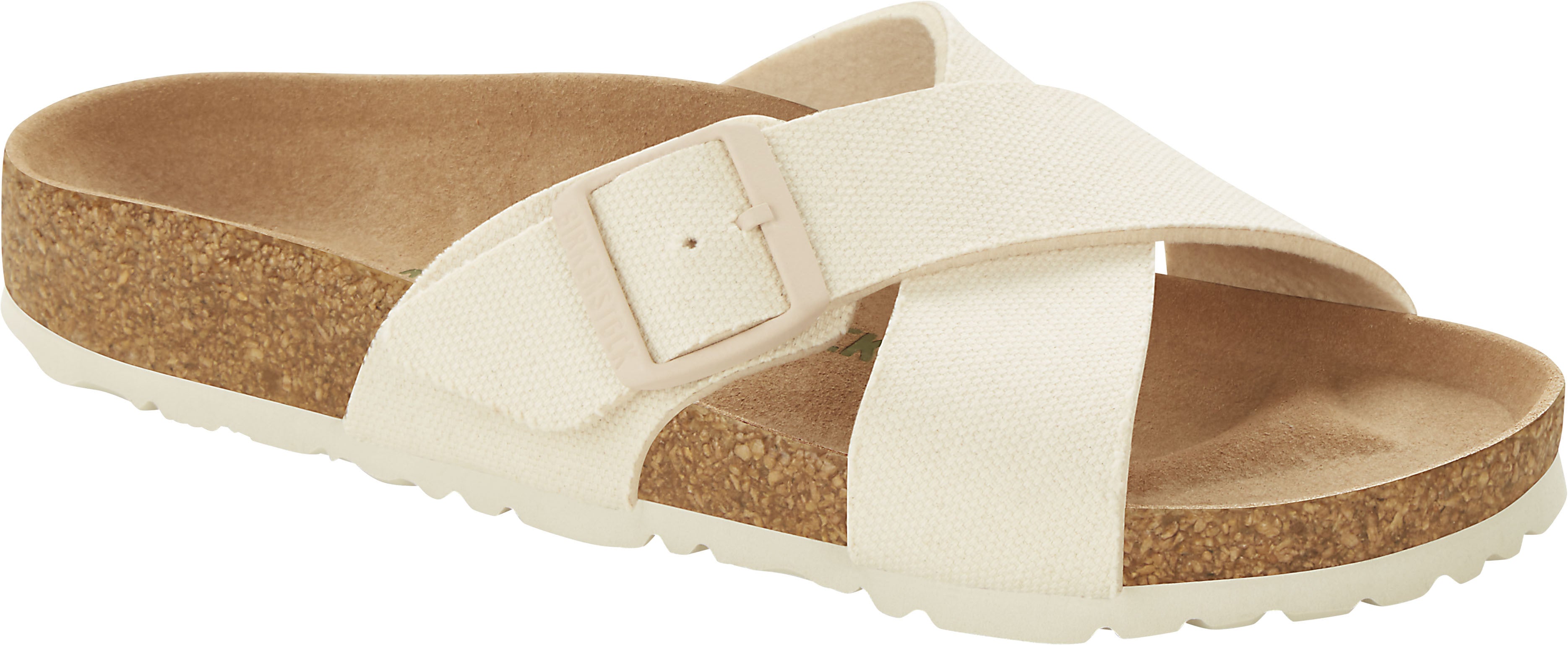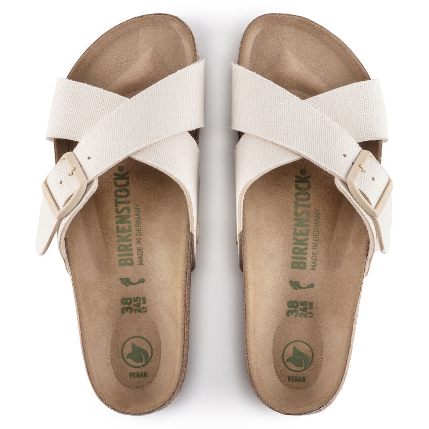 The BIRKENSTOCK Siena boasts a refined, timeless appearance. Crossed straps give the sandal its unique and elevated look. Now updated with new vegan materials. Featuring tonal, matte buckles with a textured canvas upper. The upper is made from a soft fabric.