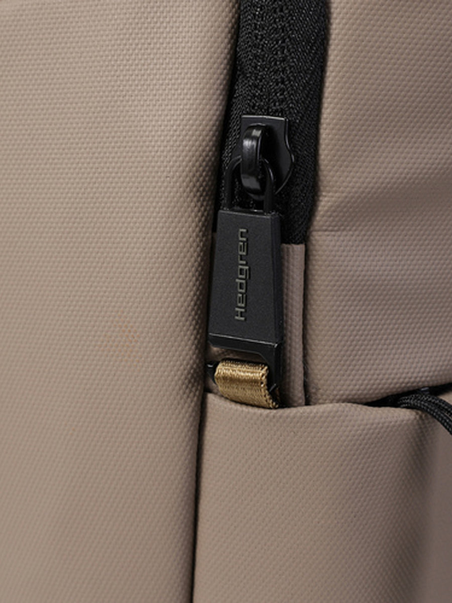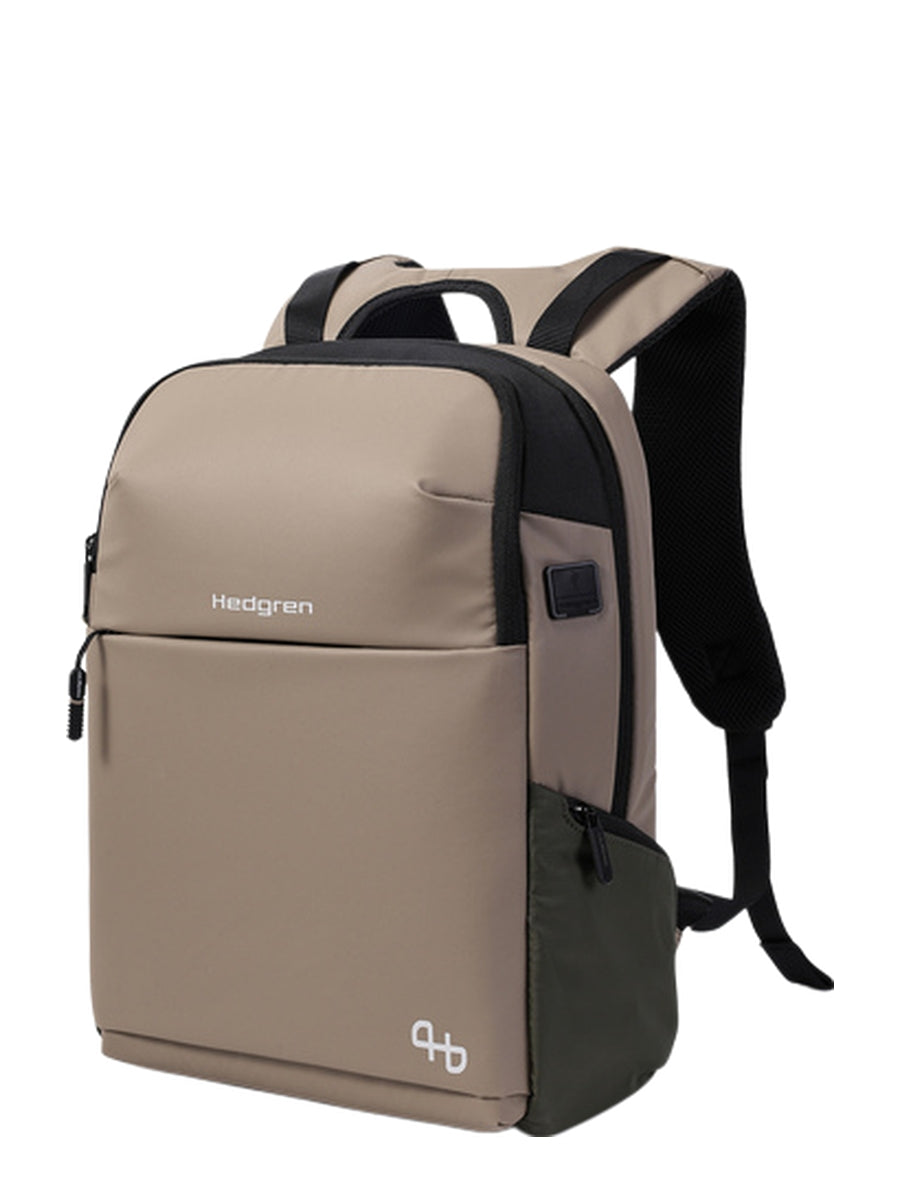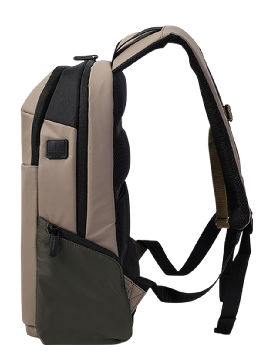 INTERIOR FEATURES -Two zippered compartments -15,4" padded computer sleeve + large open pocket -Easy access pocket with organizer: 2 open pockets, file holder, key hook, USB plug, security hook, chest strap -Zip pocket with RFID blocking material EXTERIOR FEATURES -Extra padding on the back panel and at the bottom of the bag. Padded shoulder straps -Front compartment closed by a puller with hook. -Side zip pockets that can be used to store drinks bottle or umbrella -USB port -Smart sleeve to attach bag to luggage handle -Coated water repellent fabric