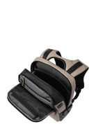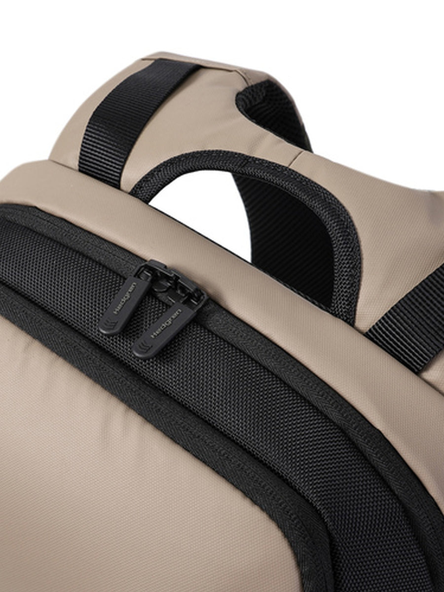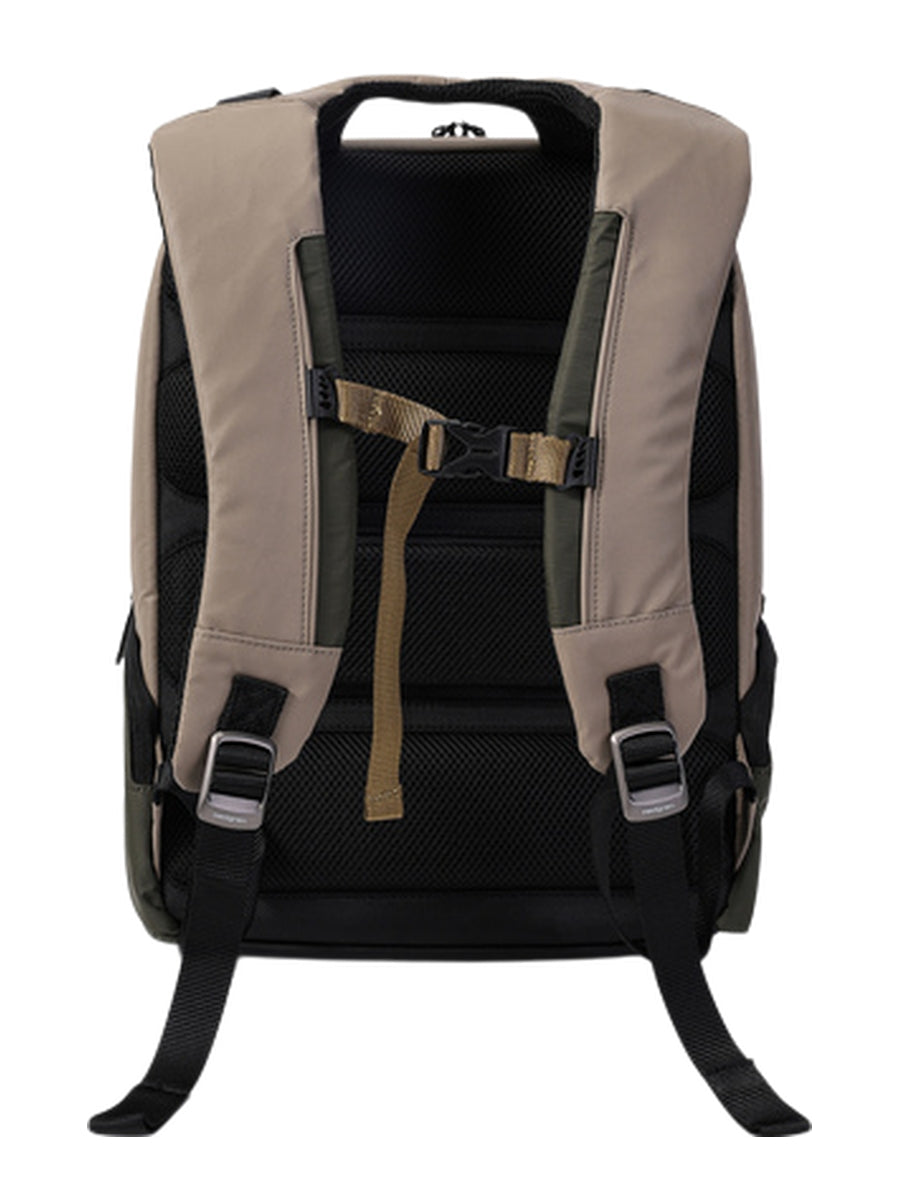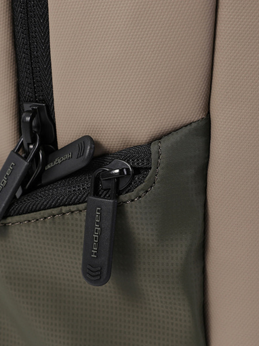 INTERIOR FEATURES -Two zippered compartments -15,4" padded computer sleeve + large open pocket -Easy access pocket with organizer: 2 open pockets, file holder, key hook, USB plug, security hook, chest strap -Zip pocket with RFID blocking material EXTERIOR FEATURES -Extra padding on the back panel and at the bottom of the bag. Padded shoulder straps -Front compartment closed by a puller with hook. -Side zip pockets that can be used to store drinks bottle or umbrella -USB port -Smart sleeve to attach bag to luggage handle -Coated water repellent fabric