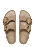 - Details: two straps, each with an individually adjustable metal pin buckle; color-coordinated footbed {n}