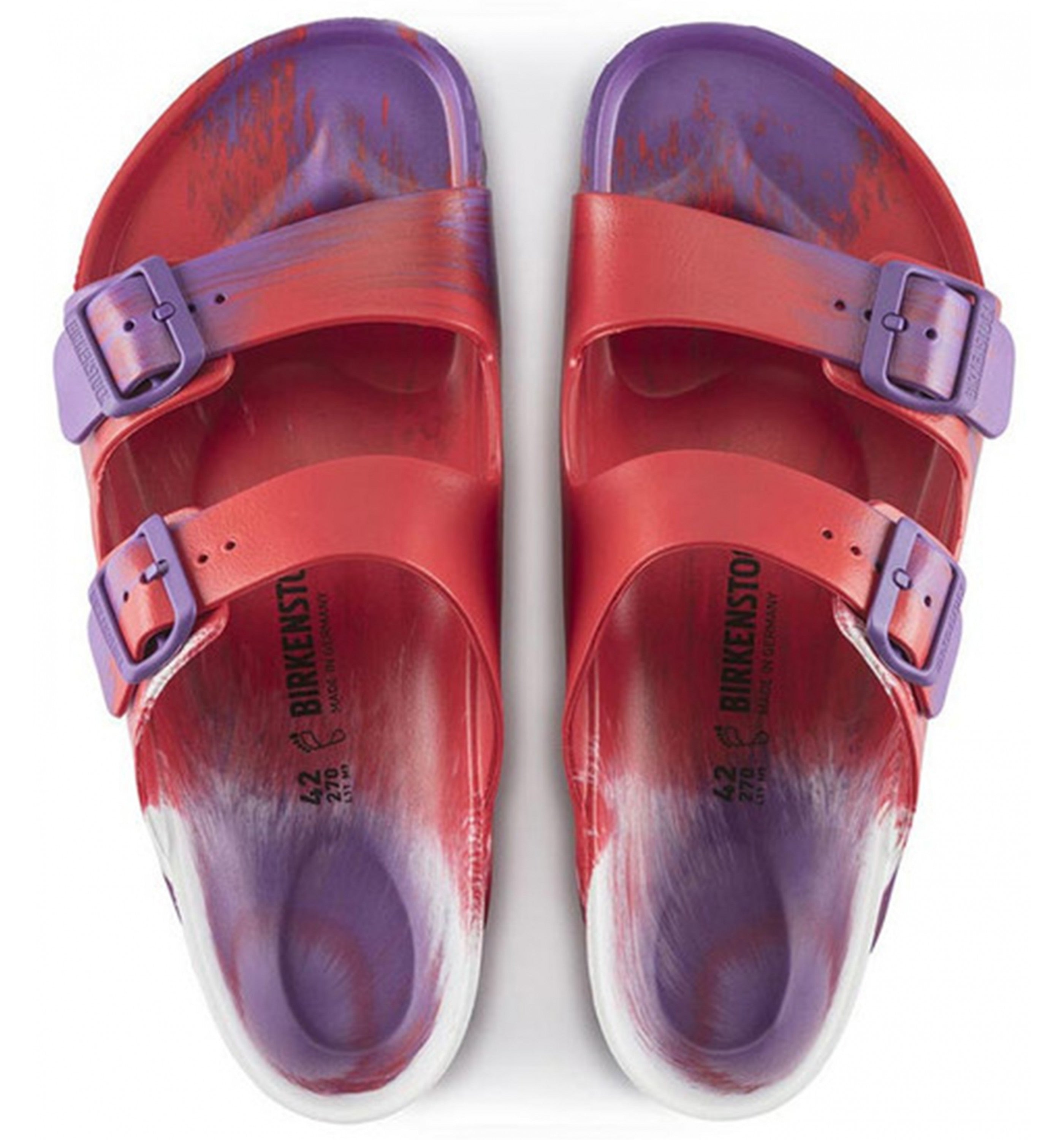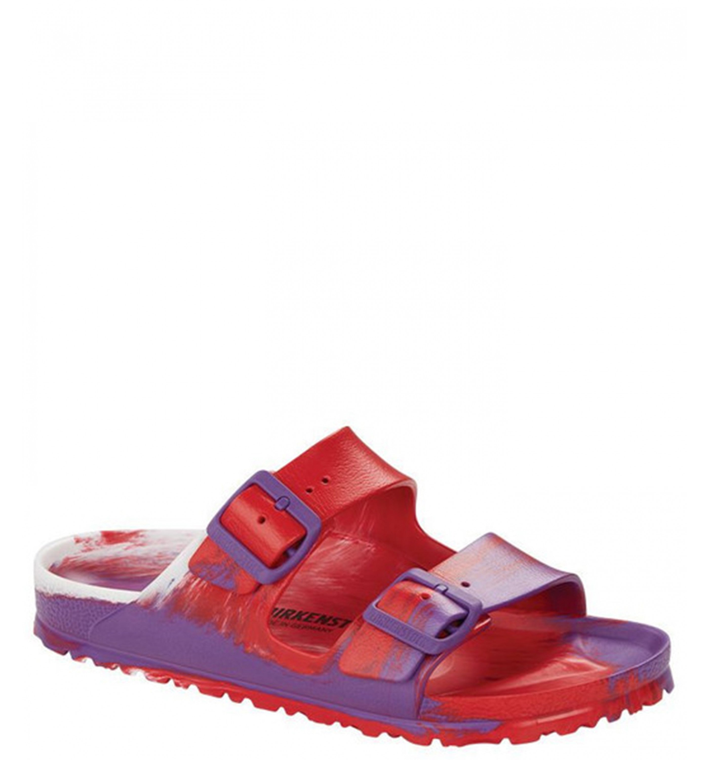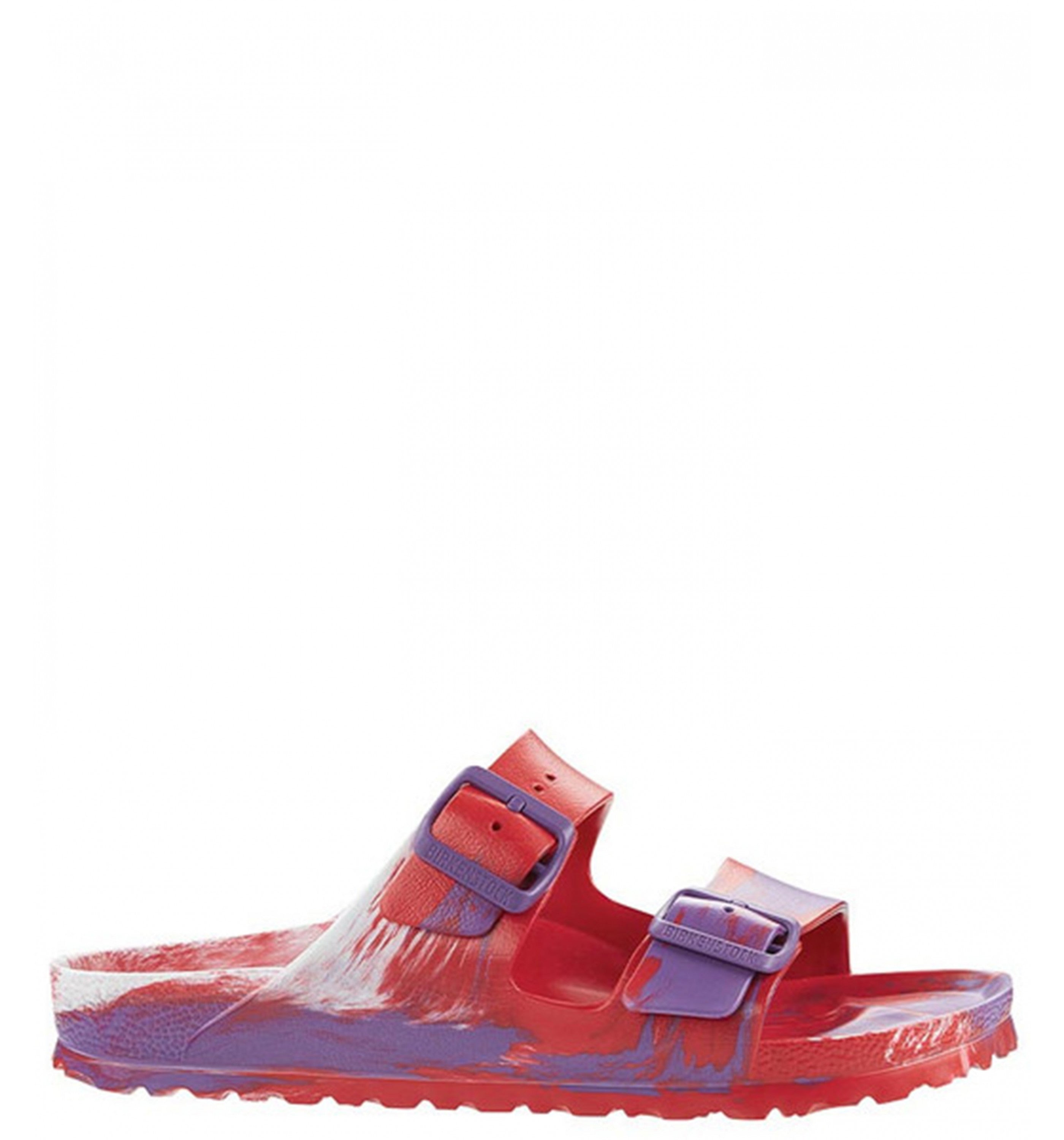 The BIRKENSTOCK Arizona is a genuine classic. Modeled on the cork sandal, this version is made from EVA. The high-quality, odor-neutral EVA has been tested for harmful substances and combines numerous positive attributes. It is ultra lightweight, highly elasticated, waterproof, skin-friendly – and offers the comfort you have come to expect from BIRKENSTOCK. The swirl of colors really catches the eye. Thanks to the creative production process during which EVA particles are heated and then melt, no two pairs are the same. The product and the distribution of colors can thus differ from the photo.