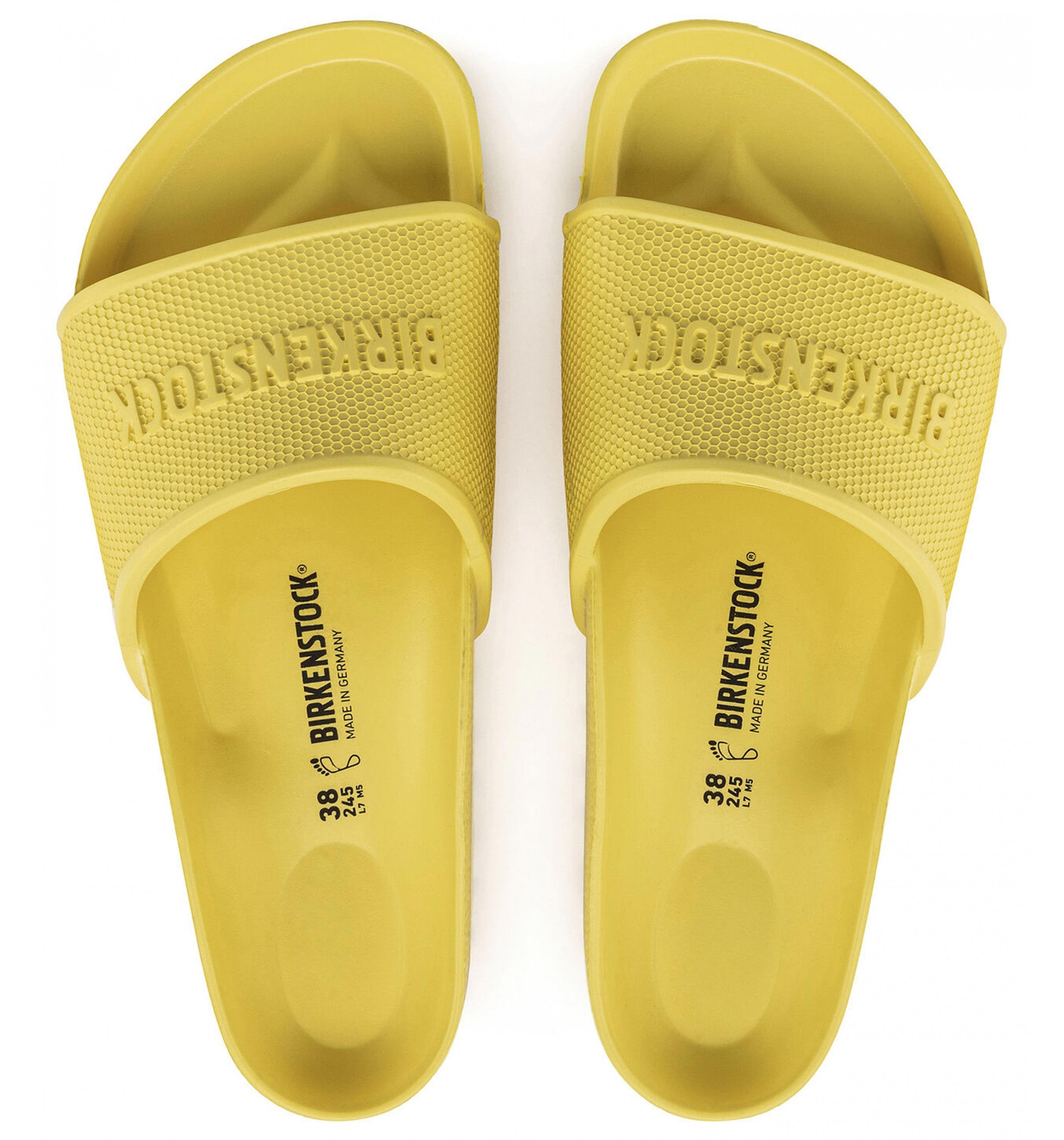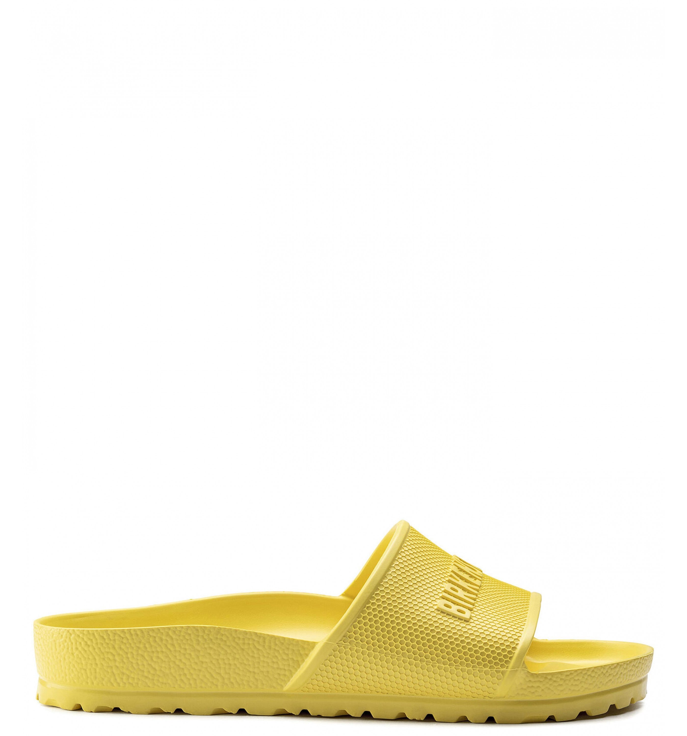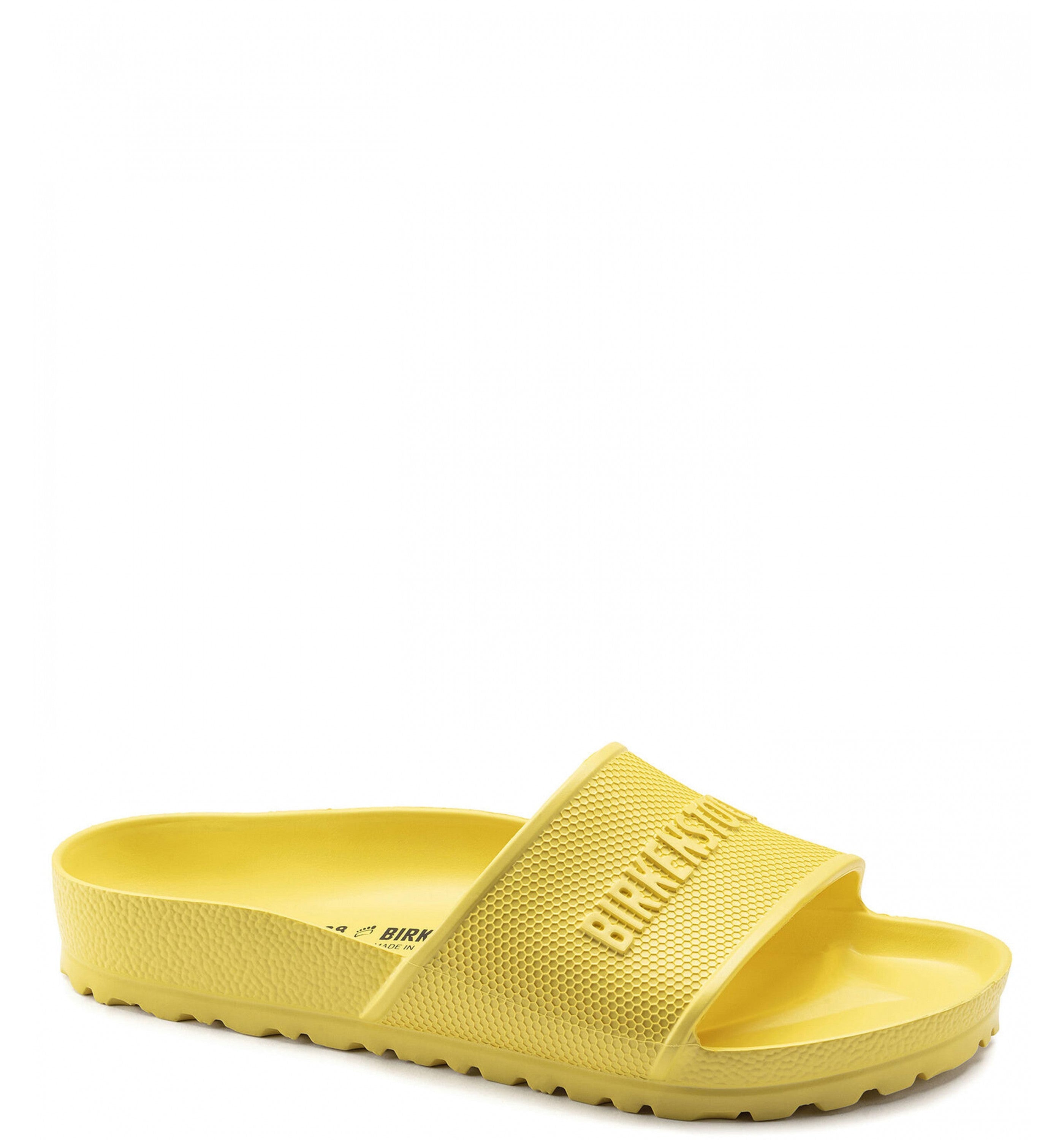 The BIRKENSTOCK Barbados is a sporty slide design with an embossed strap and logo lettering. Modeled on the cork sandal, this sandal is made from one piece of light, flexible and waterproof molded EVA.