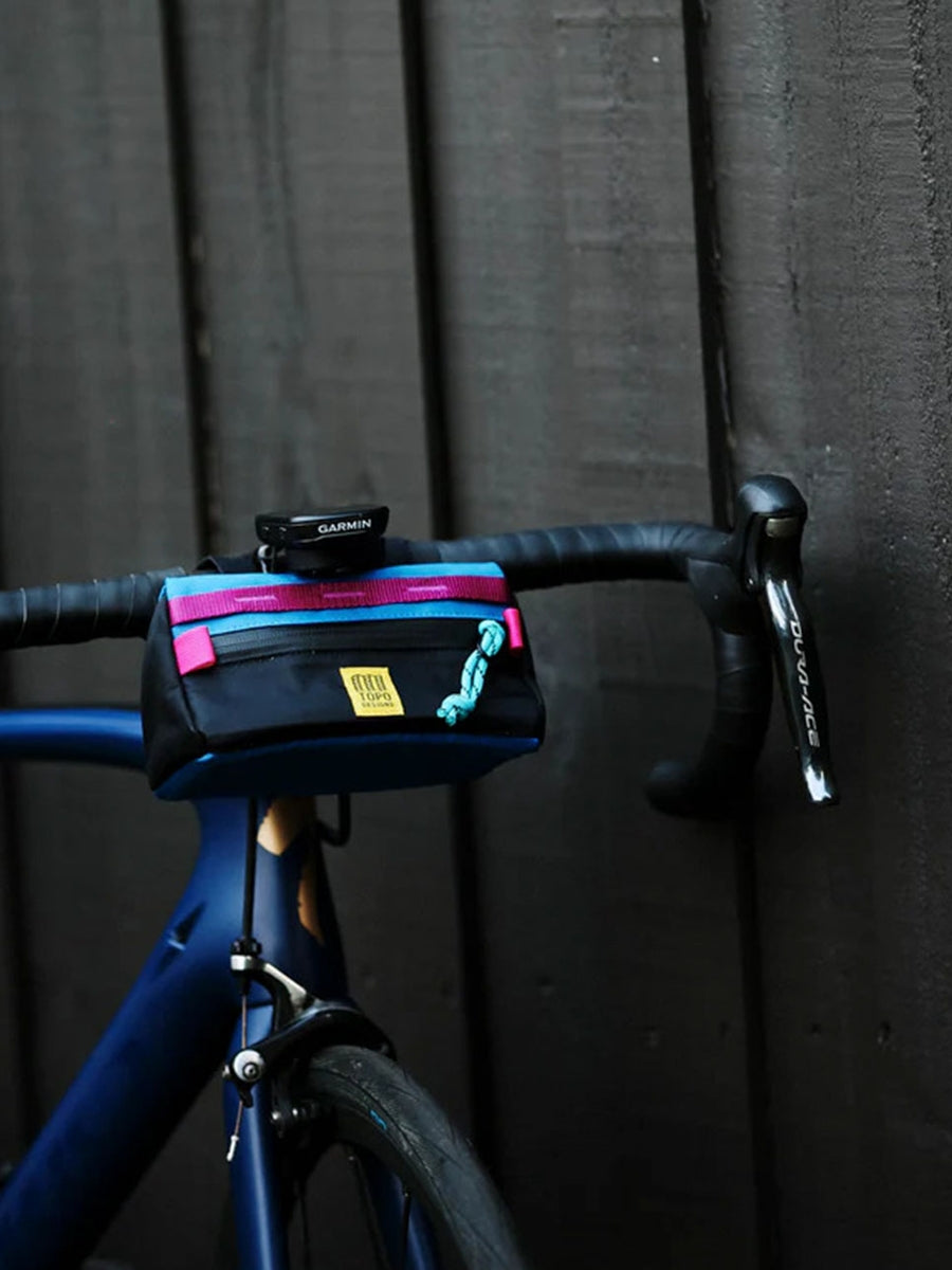 The Bike Bag Mini from our Mountain Collection is a useful accent piece to add to your daily ride or your weekend warrior mount, providing a place to stash small tools, a tube, sunglasses or an extra snack. Daisy chain webbing adds attachment points for bike lights and gear. This small but mighty bag is versatile enough to attach to the front bars of most bikes, and is the smaller version of our popular Bike Bag.
