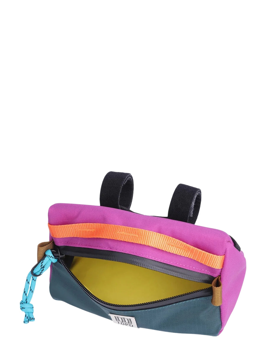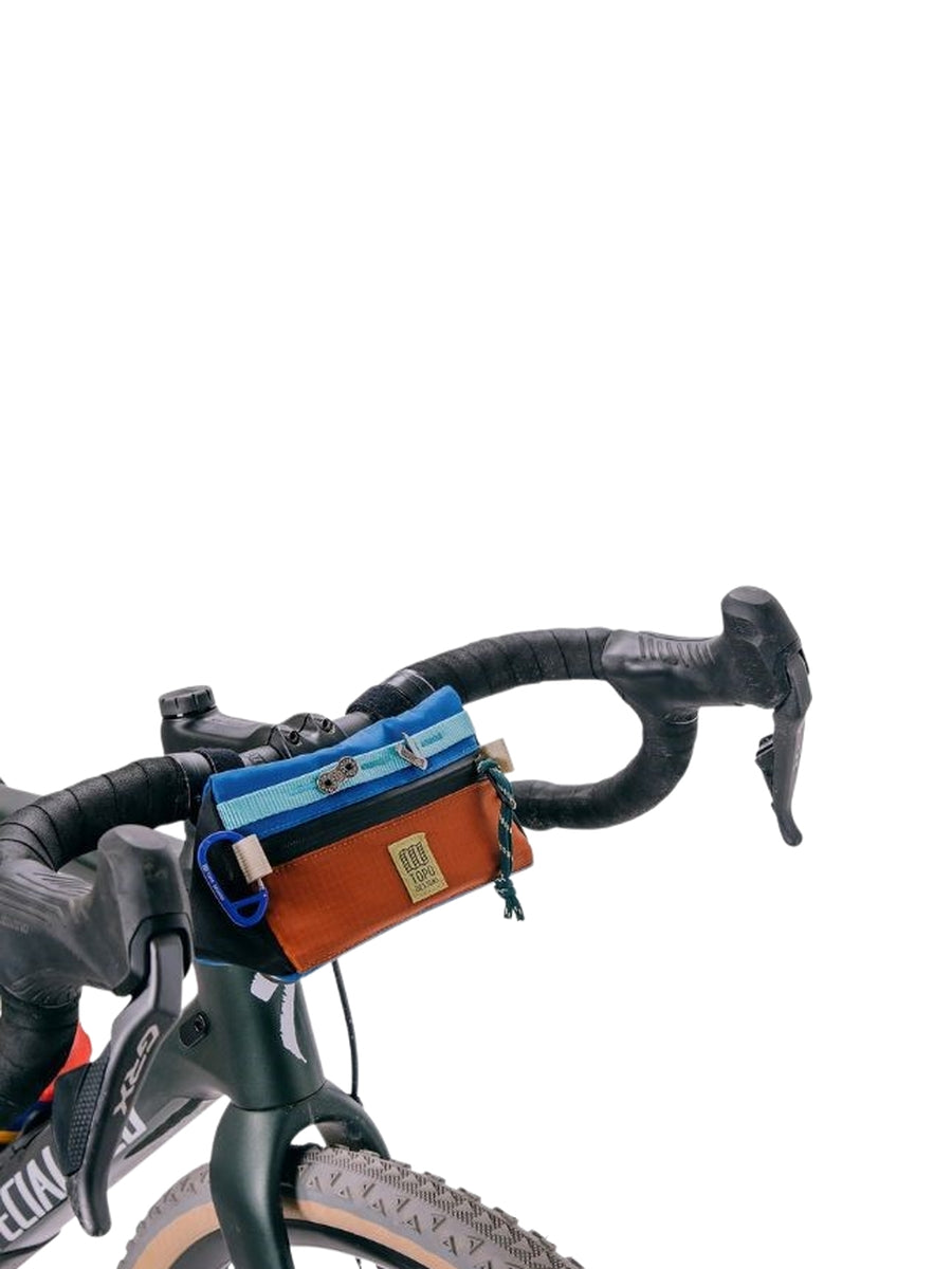 The Bike Bag Mini from our Mountain Collection is a useful accent piece to add to your daily ride or your weekend warrior mount providing a place to stash small tools a tube sunglasses or an extra snack. Daisy chain webbing adds attachment points for bike lights and gear. This small but mighty bag is versatile enough to attach to the front bars of most bikes and is the smaller version of our popular Bike Bag.