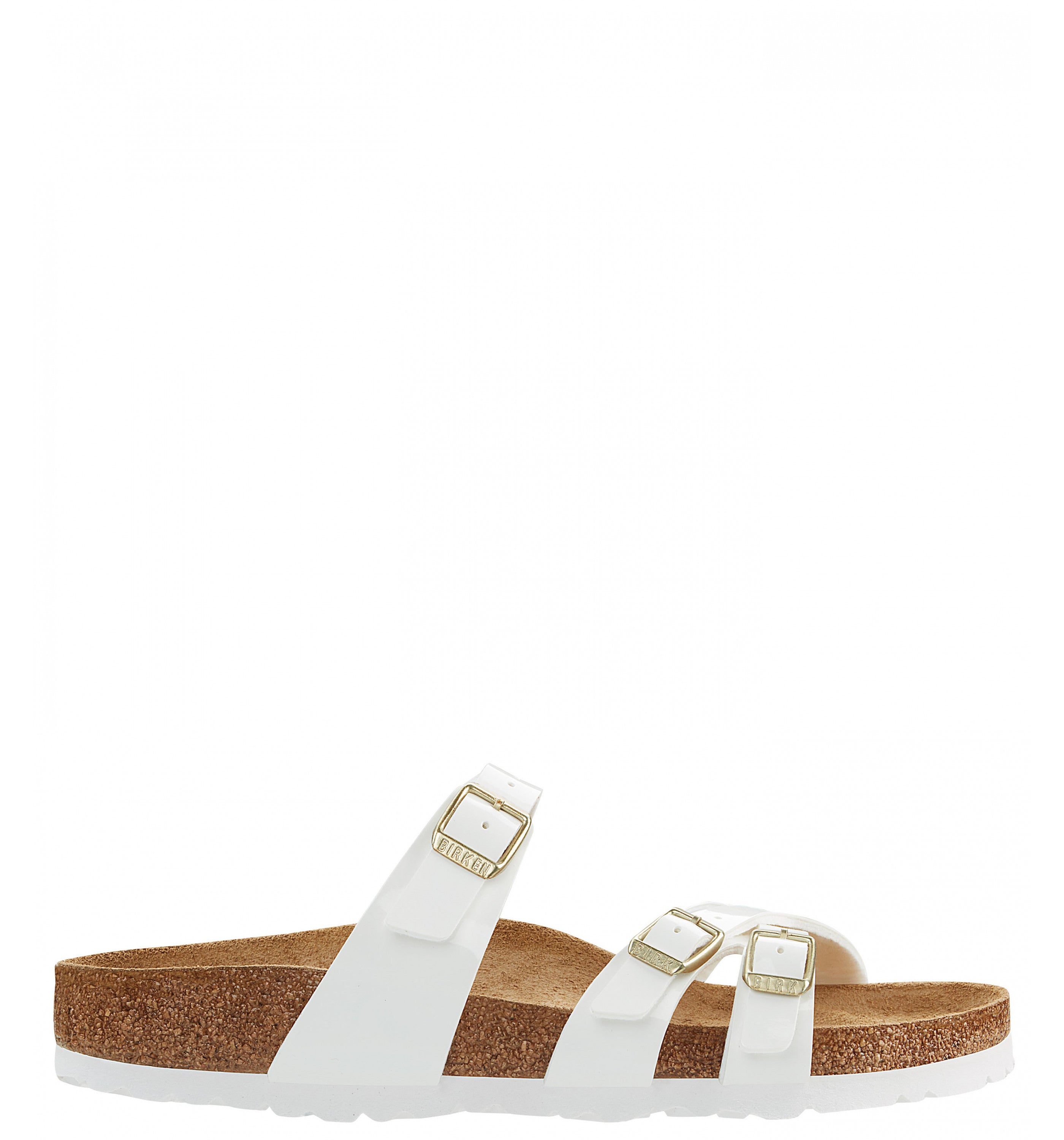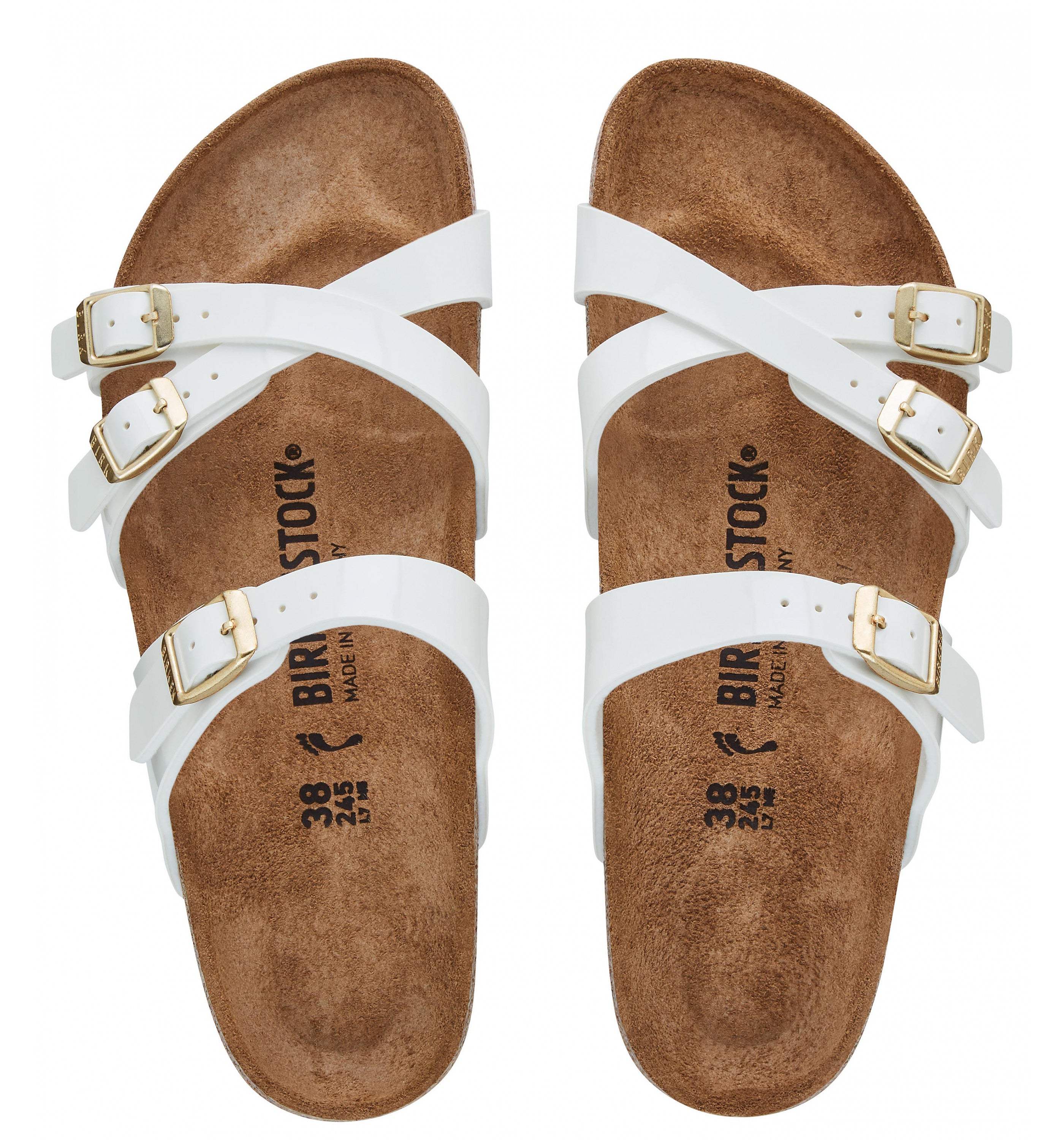 The BIRKENSTOCK Franca is a jaunty sandal with slim cross-over straps. The impressive combination of design and wearability will see fashion-conscious women through the day with elegance and comfort. The upper is made from the skin-friendly, hard-wearing synthetic material Birko-Flor® with a shiny patent coating.