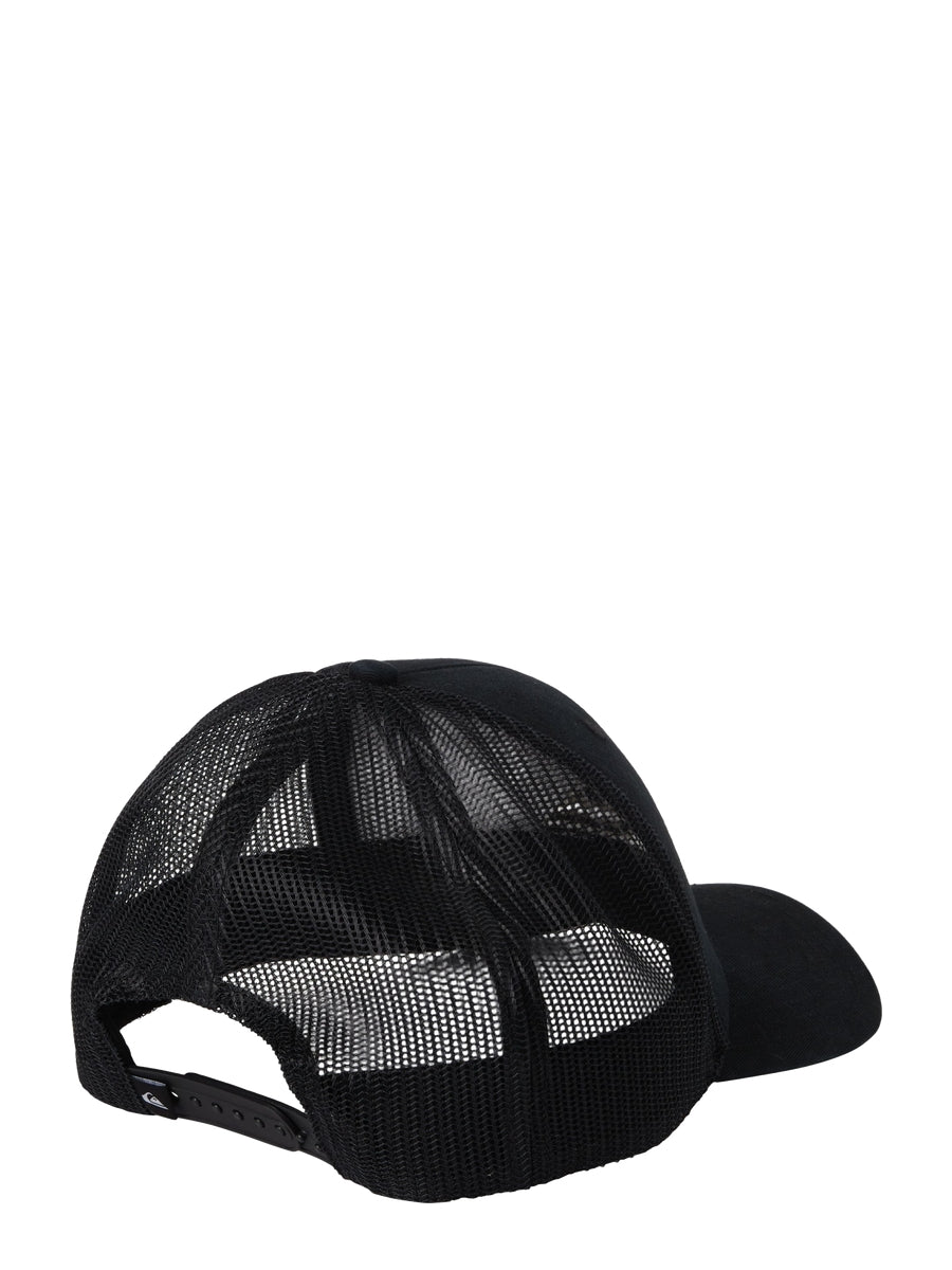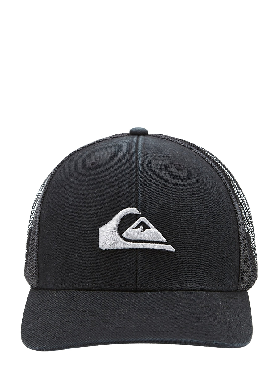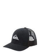 Quiksilver Grounder Trucker Hat. Twill weave front panels and mesh back panels. 6-panel low profile crown. Curved bill. 3D embroidered logo on front. Adjustable plastic snap closure.