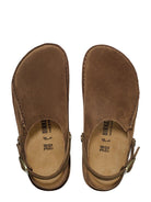 - Removable, anatomically shaped cork-latex footbed {n} - Upper: suede; nubuck leather {n} - Footbed lining: suede {n} - Sole: natural rubber with cork elements {n} - Details: clog with a flexible ankle strap and individually adjustable metal pin buckle {n} - Footbed “Made in Germany” {n}