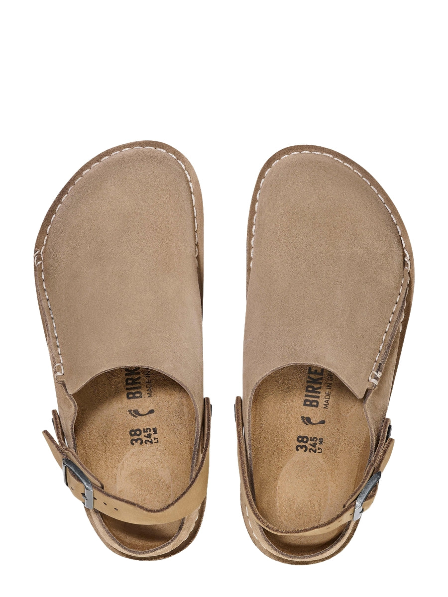 The BIRKENSTOCK Lutry is a slipper that can be worn as a backstrap style or as an open clog thanks to the flexible ankle strap. The footbed can be removed so that you can choose between three different footbed versions. This basic version of this design features our Standard Footbed. It replicates the natural print made by a foot walking on sand and will see you through the day in comfort. Its natural design is down to the upper made from especially soft suede, which hugs the foot like a second skin.