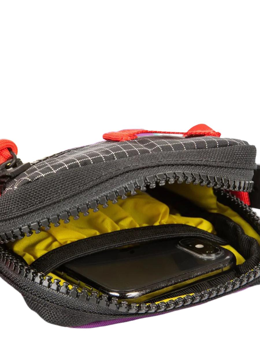 COLOR: BLACK/GRAPE DIMENSIONS L: 12 CM W: 18 CM H: 4 CM WEIGHT 0.15 kg MATERIAL: 400D 100% Recycled Nylon / 1000D 100% Recycled Nylon FEATURES: - Adjustable webbing shoulder strap - Front diagonal zippered pocket - Bike light attachment loop - Internal org pocket