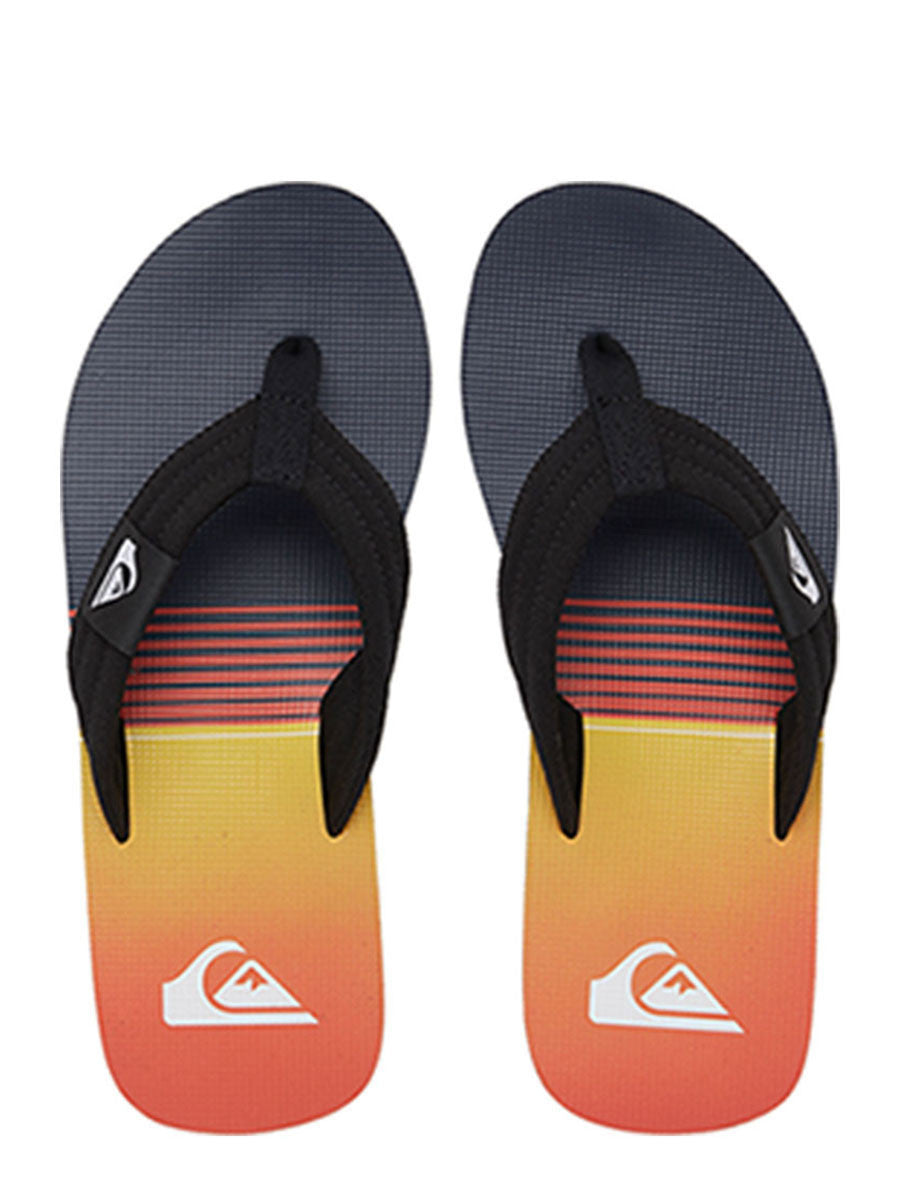 - Flexible 3 point synthetic rubber strap with Quiksilver wordmark and fine mold Mountain Wave logo - Slip resistant textured footbed - Pop color pin lines in sidewall tying into colorway - Re-engineered blown rubber outsole incorporates multi angled