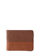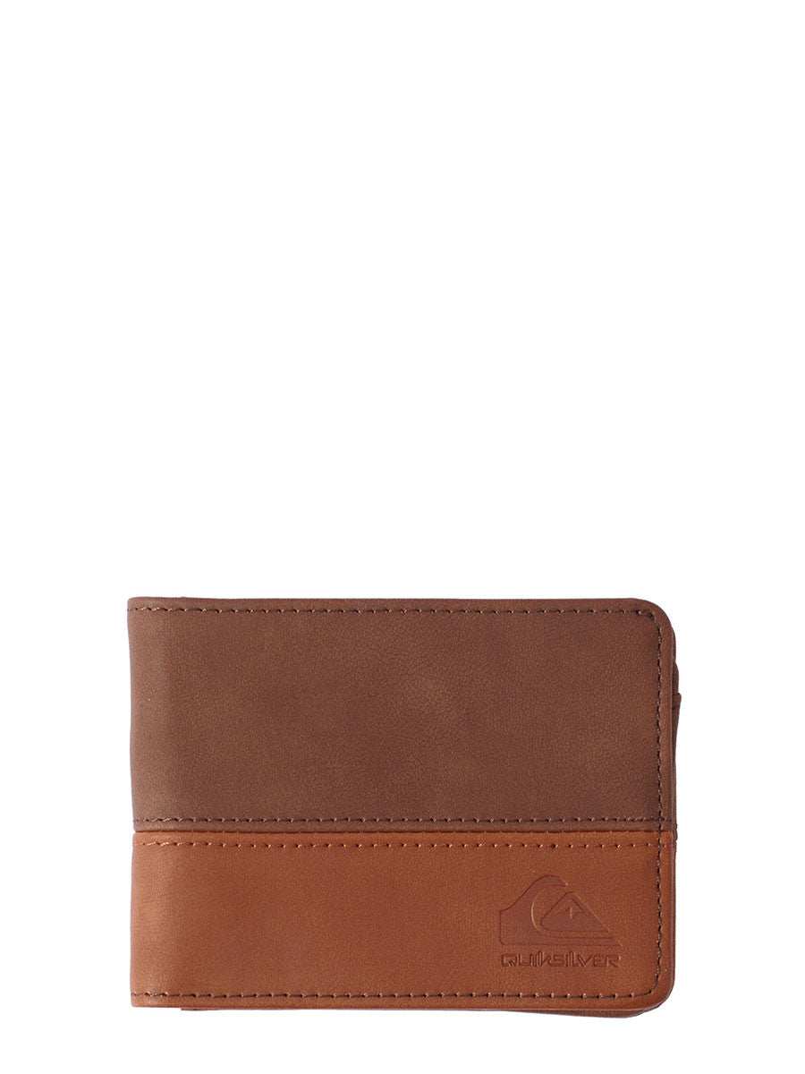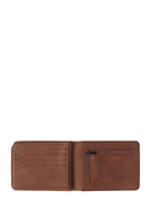 Tri-fold wallet design. Internal card flap. Panel detail on outside. Debossed art on front. Internal debossed art. Zip-up coin pocket.