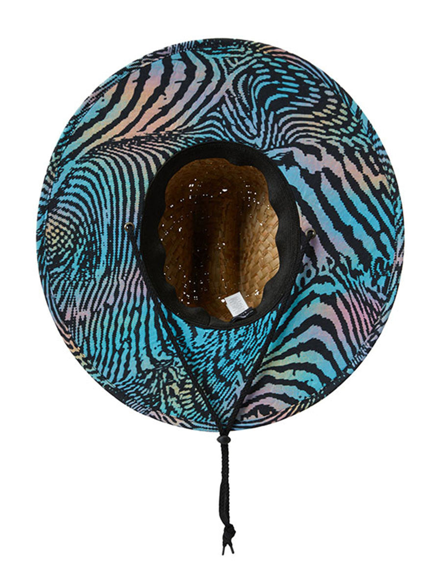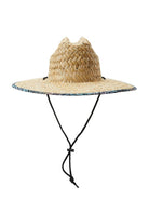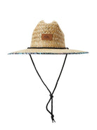 Straw lifeguard hat for men featuring printed woven fabric under brim for added sun protection, and a faux leather debossed patch on the front.