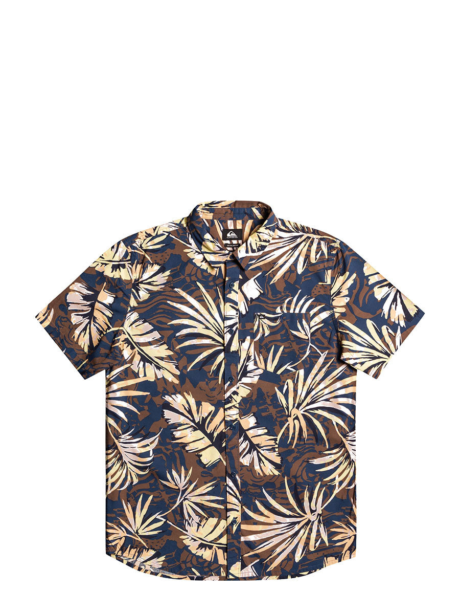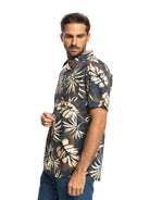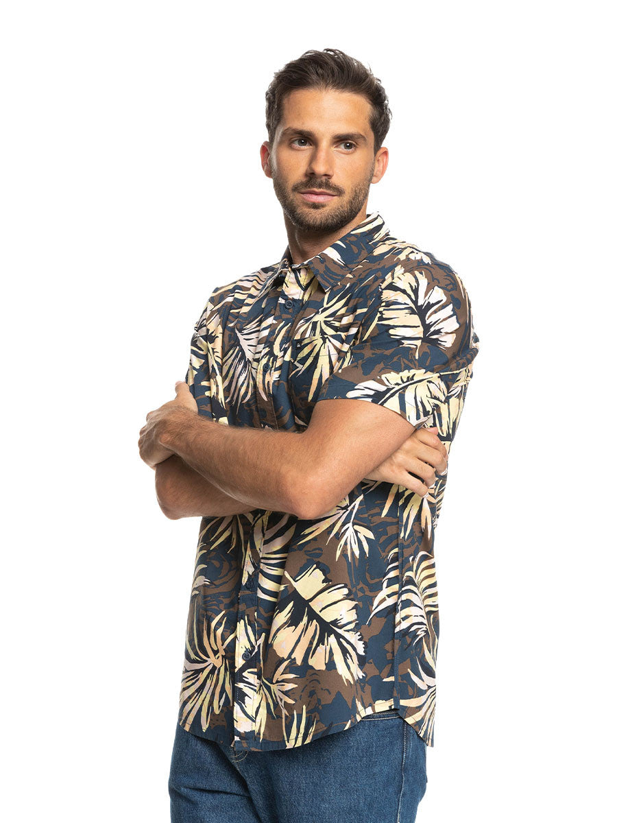 Brushed Palm Short Sleeve Shirt for Men. Features include: Fabric: Cotton viscose blend fabric [130 g/m2]; Fit: Regular fit; Pockets: Single chest pocket; Neck: Shirt collar; Closure:Button Closure; Sustainable e-flow wash; Curved hem.