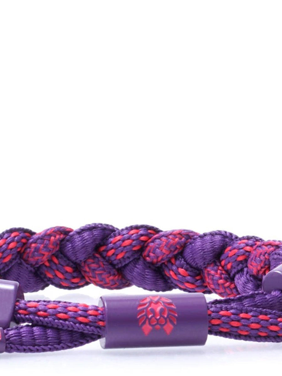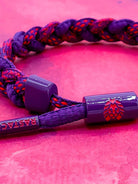 Purple and pink braided bracelet featuring enamel hardware and contrast emblems. 100% polyester. One size fits most wrists, 4.5" to 6" wrist circumference.